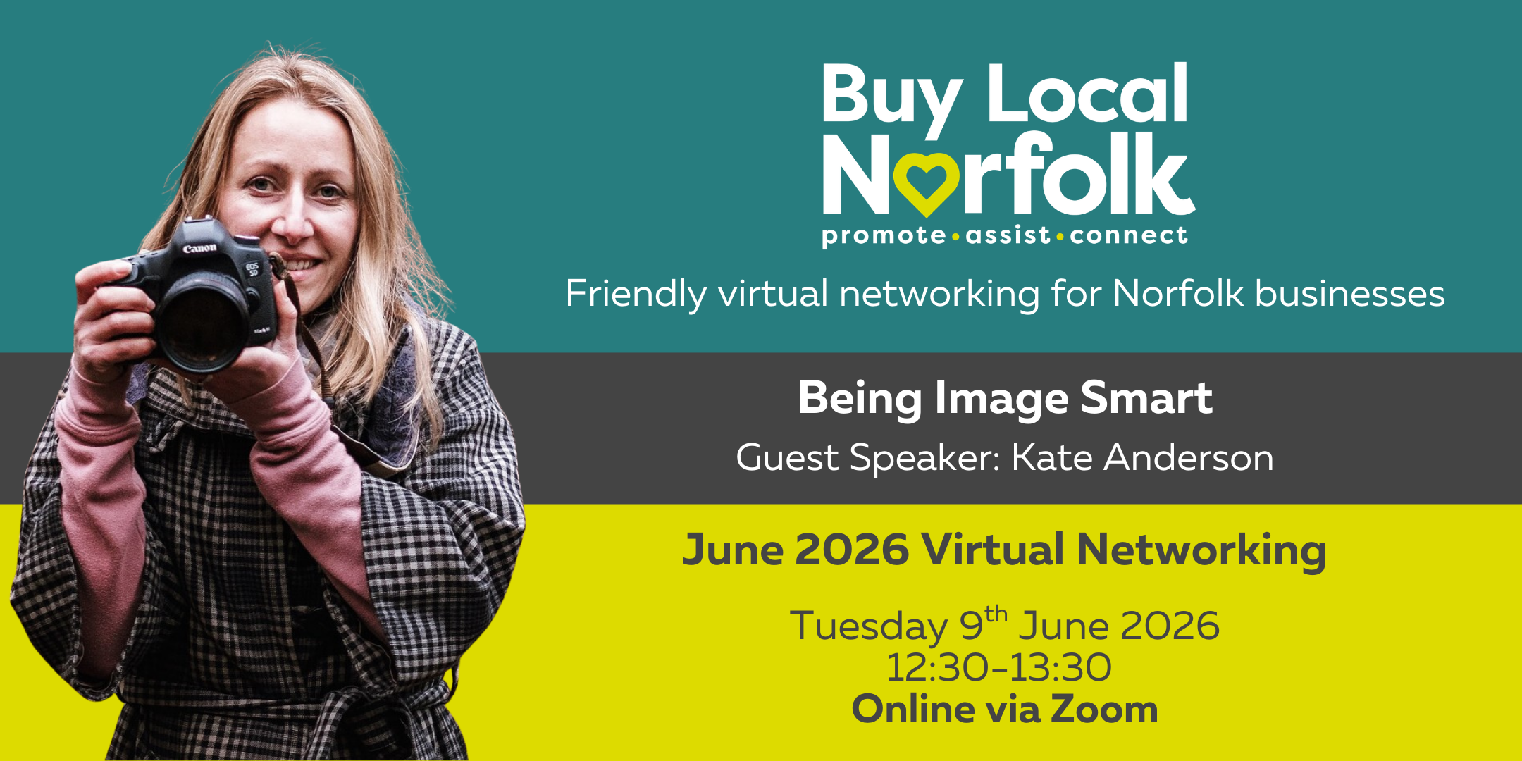 Kate Anderson will deliver a talk on being 'image smart'.  Kate will explore how the quality of visuals affects the way we're perceived professionally, outlining how images can tell a story of who we are and what we do.