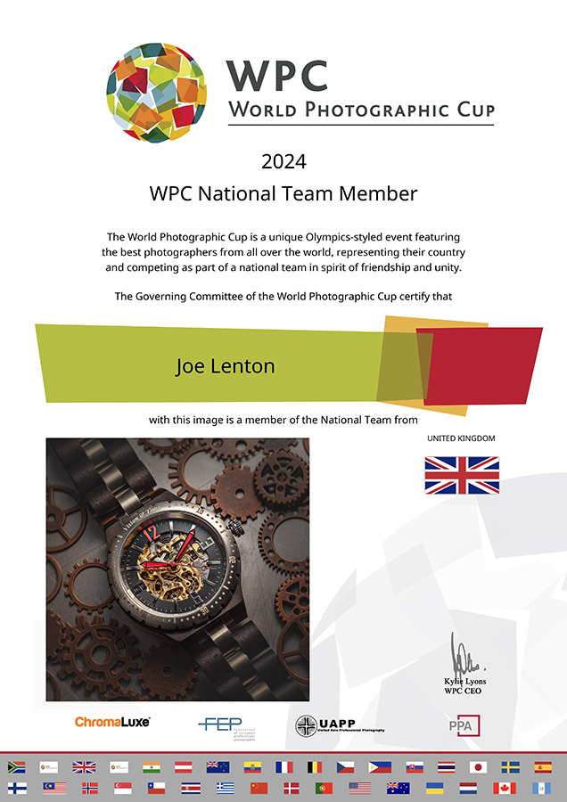 Firstly, his work was selected to represent the UK in the commercial section of the World Photographic Cup. This prestigious competition pitches international teams against one another, showcasing the very best photography in each genre. Each image has not only the potential of earning further accolades for the individual, its score also counts towards the country’s team total for the overall World Cup. Joe’s already award-winning image of a Skeleton watch was selected as one of the UK Commercial Photography entries. It is a real honour to be chosen to be on the national team and a great opportunity for even more international exposure for Joe’s work.