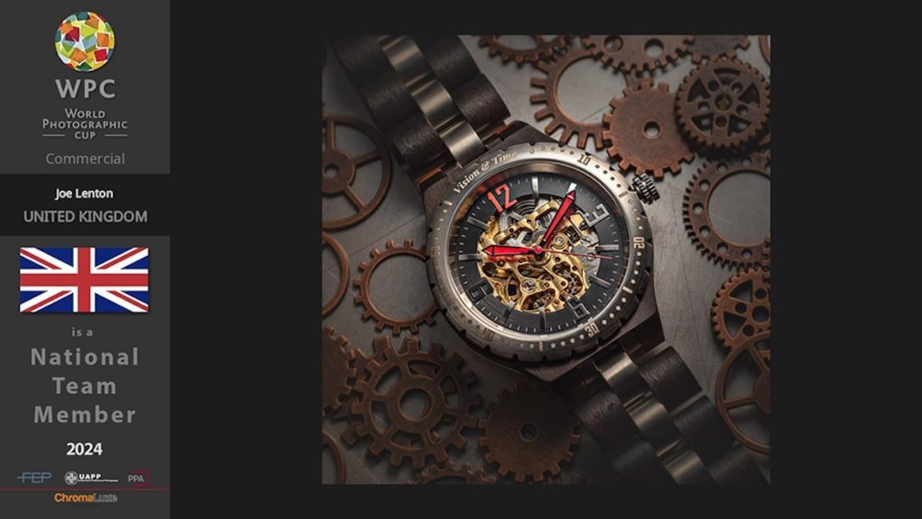Firstly, his work was selected to represent the UK in the commercial section of the World Photographic Cup. This prestigious competition pitches international teams against one another, showcasing the very best photography in each genre. Each image has not only the potential of earning further accolades for the individual, its score also counts towards the country’s team total for the overall World Cup. Joe’s already award-winning image of a Skeleton watch was selected as one of the UK Commercial Photography entries. It is a real honour to be chosen to be on the national team and a great opportunity for even more international exposure for Joe’s work.